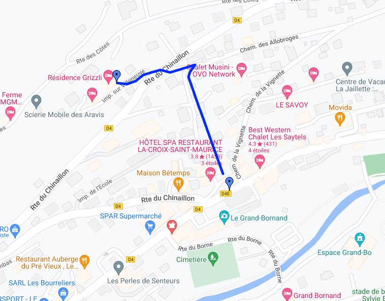 Position du chalet et chemin piéton menant au centre du village